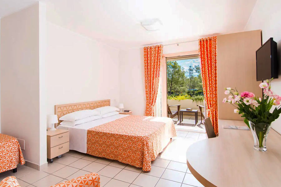 CAMERE: Le nostre camere sono pensate per accoglierti con ogni comfort. Puoi scegliere tra Suite, Junior Suite, Family, Superior e Classic. Se ne hai bisogno, puoi richiedere camere per ospiti con esigenze speciali. - Junior Suite Garden: Situate intorno alla piscina Valentino, queste suite da 41 mq sono ideali per 3 o 4 ospiti, con la possibilità di aggiungere una culla. Sono composte da zona notte con letto matrimoniale, camera con letto singolo e zona giorno con divano letto singolo (zona notte e zona giorno non sono divise da porta), bagno. Offrono aria condizionata, TV con Sky, mini-frigo, Wi-Fi, cassaforte, bollitore con tè e tisane, macchina espresso, open frigo bar con acqua, 2 bibite e birra, noleggio gratuito di un telo mare a persona (a partire dai 3 anni) con cambio giornaliero. Sono al piano terra, dove ti aspettano con un patio e il giardino, per goderti l’aria aperta dalla tua camera. - Suite: Poste intorno alla piscina Valentino, sono di 29 mq e sono perfette per 2 e 3 ospiti, con possibilità di aggiungere una culla. Puoi godere di spazi separati grazie alla porta che divide la camera matrimoniale dalla zona giorno con divano letto singolo e bagno. Trovi aria condizionata, TV, mini-frigo, Wi-Fi, cassaforte, bollitore con tè e tisane, macchina espresso, open frigo bar con acqua, 2 bibite e birra, noleggio gratuito di un telo mare a persona (a partire dai 3 anni) con cambio giornaliero. Puoi scegliere tra Suite Balcony al secondo piano con balcone, Suite Pool View al secondo piano con balcone vista piscina, Suite Terrace Pool View al secondo piano con ampio terrazzo angolare con vista sulla piscina, arredato con ombrellone, tavolo e 2 lettini. - Deluxe Suite: Se desideri ancora più spazio, le nostre Deluxe Suite, poste intorno alla piscina Valentino, di 40-41 mq sono a tua disposizione. Ospitano da 3 a 5 persone e sono composte da zona notte con camera matrimoniale e camera con letto a castello singolo. Nella zona giorno trovi un divano letto singolo. Hanno tante dotazioni per il tuo comfort: aria condizionata, TV, mini-frigo, Wi-Fi, cassaforte, bollitore con tè e tisane, macchina espresso, open frigo bar con acqua, 2 bibite e birra, noleggio gratuito di un telo mare a persona (a partire dai 3 anni) con cambio giornaliero. Puoi scegliere tra Deluxe Suite Garden al piano terra con patio e giardino, Deluxe Suite Balcony al primo piano con balcone, Deluxe Suite Pool View al primo piano con balcone vista piscina, Deluxe Suite Terrace Pool View al primo piano con ampio terrazzo vista piscina arredato con ombrellone, tavolo e 2 lettini.- Deluxe Family Suite Garden Sono nell’edificio centrale a corte intorno alla piscina Valentino, offrono 54 mq e possono accogliere da 4 a 6 ospiti. Puoi anche chiedere di aggiungere una o due culle (con due culle lo spazio sarà un po’ più raccolto). Sono composte da zona notte con camera matrimoniale, una camera con letto a castello e una camera con letto singolo; zona living con divano letto singolo; 2 bagni (di cui uno completo). Trovi aria condizionata, TV, mini-frigo, Wi-Fi, cassaforte, bollitore con tè e tisane, macchina espresso, open frigo bar con acqua, 2 bibite e birra), noleggio gratuito di un telo mare a persona (a partire dai 3 anni) con cambio giornaliero. Sono tutte al piano terra e ti permettono di godere di ampi spazi esterni: patio e ampio giardino angolare. - Superior Tripla: Perfette per 3 ospiti e in alcune possiamo aggiungere una culla. Se viaggi con due bambini tra 0 e 3 anni non compiuti, accoglieremo i tuoi piccoli con 1 culla di tipo pieghevole e 1 letto singolo con spondine (in questo caso lo spazio sarà un po’ più raccolto). Sono a circa 250 m da Piazza Ethra e offrono letto matrimoniale e letto singolo, aria condizionata, TV, mini-frigo, cassaforte, bagno. Puoi scegliere tra Superior al piano terra con patio o al primo e secondo piano con balcone. Se hai con te un cagnolino, abbiamo anche Superior Dog room, e se hai esigenze speciali, Superior con arredi per diversamente abili. - Camera Superior Family: Perfette per accogliere fino a 4 ospiti, le nostre Superior Family sono pensate per il tuo comfort e quello dei tuoi cari. Situate negli edifici a soli 250 metri da Piazza Ethra, offrono tutto ciò che serve per un soggiorno indimenticabile. Sono composte da zona notte con camera matrimoniale, camera con 2 letti singoli e zona giorno con divano letto singolo, e puoi chiedere di aggiungere una o due culle (con due culle lo spazio sarà un po’ più raccolto). Offrono aria condizionata, TV con Sky anche per bambini, mini-frigo, bollitore con tè e tisane, cassaforte e 2 teli mare Serenella in omaggio per la gioia dei più piccoli. Puoi scegliere tra camere al piano terra con un patio privato per momenti di relax all’aria aperta o camere ai piani superiori con balcone, perfette per ammirare i dintorni. - Family Suite: Immagina un luogo in cui ogni membro della tua famiglia trova il suo spazio, un rifugio di 78 mq ideale per accogliere da 4 a 8 ospiti. Le nostre Family Suite, situate a soli 250 metri da Piazza Ethra, ti offrono tutto il comfort e la privacy che desideri. Sono composte da ampia zona giorno con 2 divani letto singoli, due camere matrimoniali, una camera con 2 letti singoli, 2 bagni. Se ne hai bisogno, hai la possibilità di aggiungere una o due culle (con due culle lo spazio sarà un po’ più raccolto). E poi, aria condizionata, TV con Sky anche per bambini, mini-frigo, cassaforte, bollitore con tè e tisane, 2 teli mare della nostra mascotte Serenella in omaggio per i più piccini. Sono al piano terra, con un ampio patio privato dove puoi rilassarti all’aria aperta. - Camera Classic Tripla: Le nostre Classic Triple offrono il massimo della comodità in un ambiente pratico e rilassante. Ideali per 2 o 3 ospiti, con la possibilità di aggiungere una culla, queste camere si trovano nel raggio di 400 metri da Piazza Ethra. Offrono camera con letto matrimoniale e letto singolo, aria condi