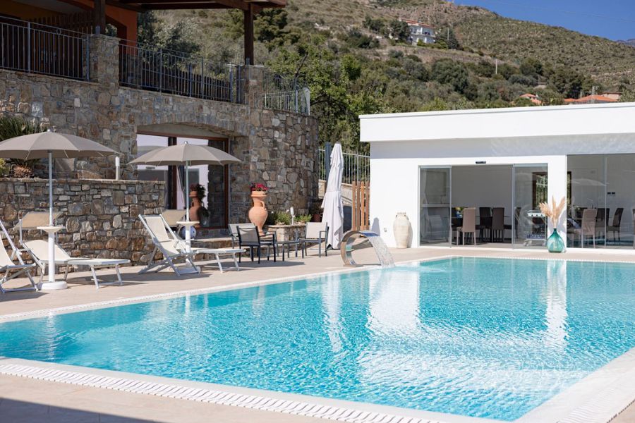Piscina e Solarium: Un angolo in cui abbandonarti al relax: avvolto nell'abbraccio della piscina, rigenerato dall'idromassaggio, abbandonato al comfort del solarium rapito dal panorama mozzafiato del mare cilentano.