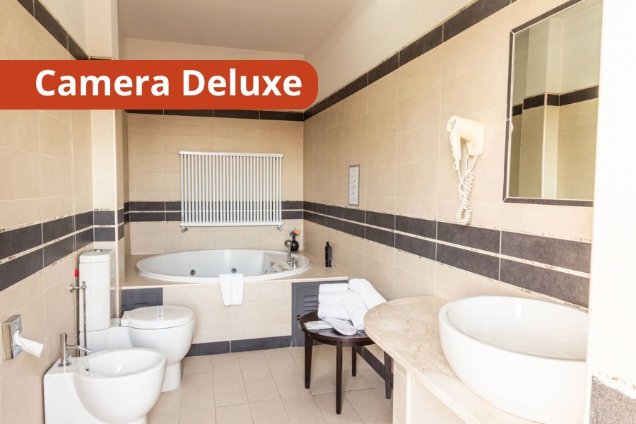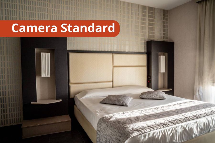 CAMERE: Le camere dell'Hotel Premiere sono caratterizzate da un design moderno ed elegante, ideali sia per viaggi di lavoro che di piacere. Ogni stanza offre un ambiente accogliente e rilassante grazie ai colori neutri e agli arredi essenziali. Le camere variano in dimensioni e comfort, garantendo una sistemazione adeguata per ogni esigenza, dal relax delle coppie alla praticità dei viaggiatori singoli. Matrimoniale Standard - Le camere Standard sono il connubio perfetto tra modernità ed eleganza. Graziose ed accoglienti, perfette per i viaggi di lavoro ma anche per i soggiorni di piacere. I colori neutri e l’essenzialità degli arredi contribuiscono a creare un ambiente di puro relax. Con una dimensione di 20mq è dotata di una ampia gamma di servizi a tua disposizione: parcheggio gratuito, minibar, wifi, aria condizionata, cassaforte, ampio armadio, asciugacapelli, scrivania, tv satellitare, sveglia. Matrimoniale Deluxe - Solari e accoglienti, le Camere Deluxe sono pensate per un soggiorno all’insegna del relax. Dotate di vasca idromassaggio circolare. Con una dimensione di 30mq è dotata di una ampia gamma di servizi a tua disposizione: parcheggio gratuito, minibar, wifi, aria condizionata, cassaforte, ampio armadio, asciugacapelli, scrivania, tv satellitare, sveglia. Matrimoniale Superior - Ampie dallo stile italiano, le camere Superior sono adatte per ospitare coppie desiderose di relax. Dotate di vasca idromassaggio rettangolare capaci di ospitare 2 persone. Con una dimensione di 30mq è dotata di una ampia gamma di servizi a tua disposizione: parcheggio gratuito, minibar, wifi, aria condizionata, cassaforte, ampio armadio, ingresso gratuito in piscina dal check in al check out, asciugacapelli, scrivania, tv satellitare, sveglia.