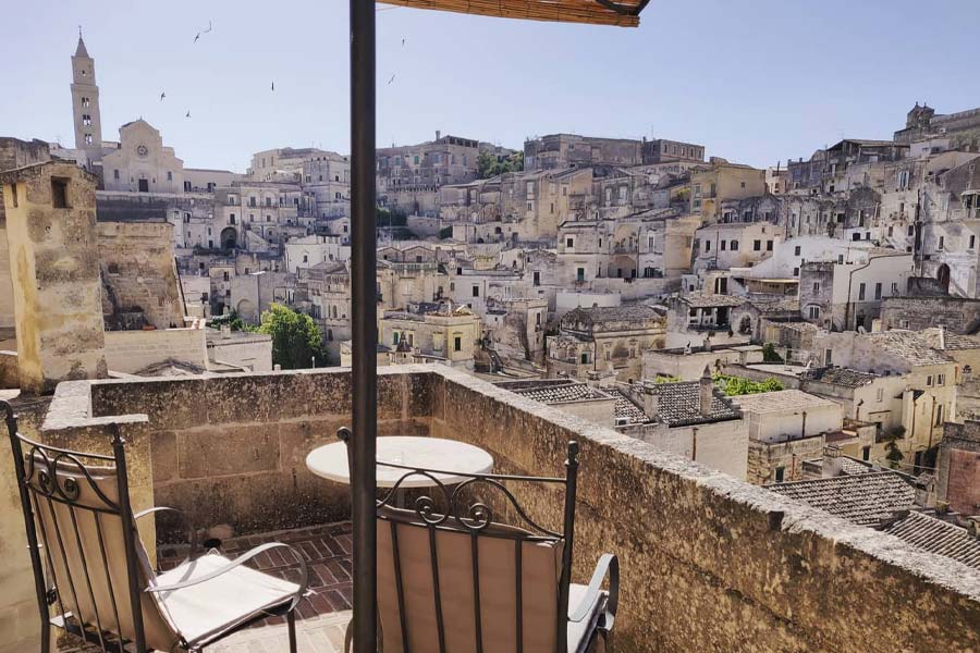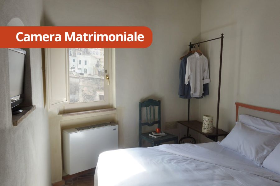 Le Camere: Junior Family Suite (max pax 4 – mq. 36-50): Camera tradizionale in grotta e/o con volta in tufo di grandi dimensioni, con vasca idromassaggio e vista sui Sassi di Matera; Junior Suite (mq. 30-35) Camera tradizionale in grotta e/o con volta in tufo, con terrazzo e vista sui Sassi di Matera. Vasca idromassaggio su richiesta; Superior Matrimoniale/Doppia In Grotta Con Vista Città (mq. 23-29): Camera tradizionale in grotta e/o con volta in tufo, con terrazzo comune e vista sui Sassi di Matera; Superior Matrimoniale/Doppia In Grotta (mq. 23-29): Camera tradizionale in grotta e/o con volta in tufo, con affaccio su vicolo o su cortile interno. Matrimoniali/Doppia non In Grotta Con Vista Città (mq. 19-22): Camera non in grotta, con vista sui Sassi di Matera.