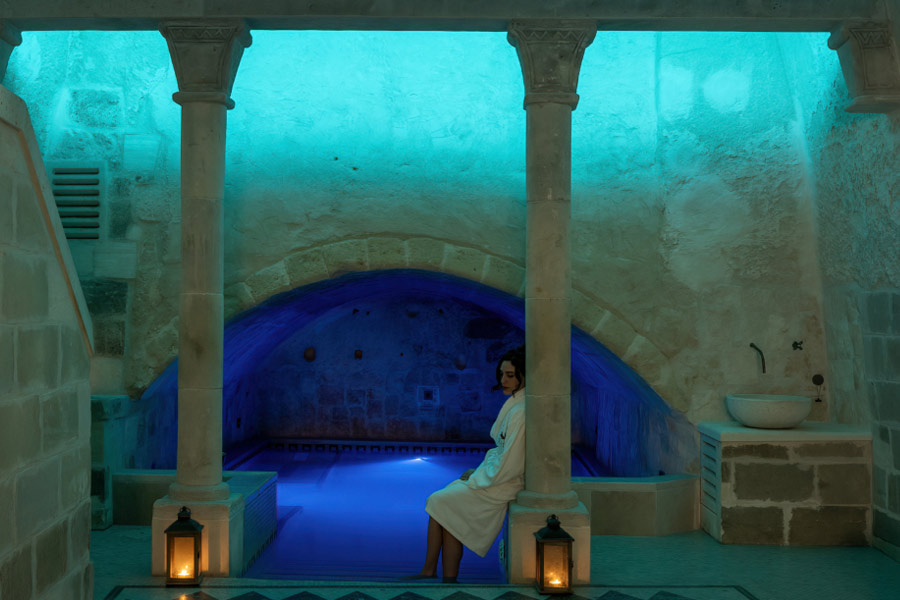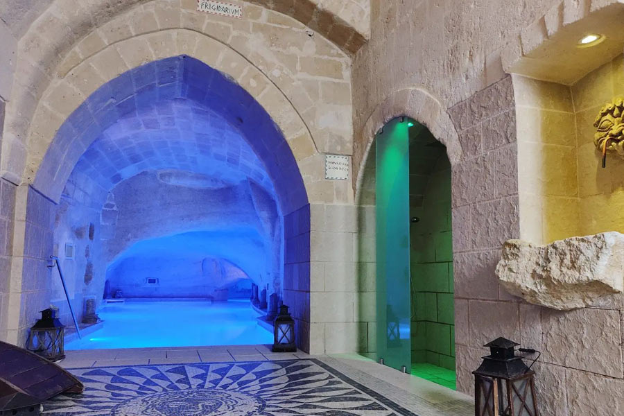 Spa: Le Antiche Termae Romanae della Locanda di San Martino sono un sito rituale consacrato al mito della Medusa. Vi muoverete attraverso cunicoli e cisterne in un luogo senza tempo dove suoni, luci e colori vi riporteranno nella quiete del grembo materno. Dopo esservi cambiati nell’apodyterium (spogliatoio), coperti di un telo, accederete all’anti-tepidarium (temperatura 28°) per una tiepida doccia cromoterapica. Da qui scenderete nel calidarium o hammam (temperatura >50° – umidità 100%) per immergervi in un bagno di vapore che dilaterà i vasi sanguigni, allontanerà lo stress e vi lascerà in uno stato di piacevole spossatezza. Risalite verso la camera di caldo secco (sauna, temperatura >50°) per allentare la tensione, aprire i pori e lavar via ogni impurità. Passate alla biosauna al fieno greco (temperatura 40°, umidità 40%) per iniziare a raffreddare il corpo, e a seguire rigeneratevi con una doccia fredda che stimolerà la circolazione sanguigna venosa. Continuate il percorso sdraiandovi sulle chaise longue nella vasca idromassaggio in pietra per un massaggio completo. Concludete il percorso con una nuotata rilassante e tonificante nel frigidarium (29°), la piscina in grotta in fondo alla quale troverete una cisterna con idromassaggio per piedi e zona lombare. Nella cisterna con cromoterapia del tepidarium (temperatura 30°) potete rilassarvi gustando una tisana biologica e abbandonandovi agli effetti luminosi e sonori dell’acqua che scorre. Il percorso benessere ha una durata massima di 90 minuti.