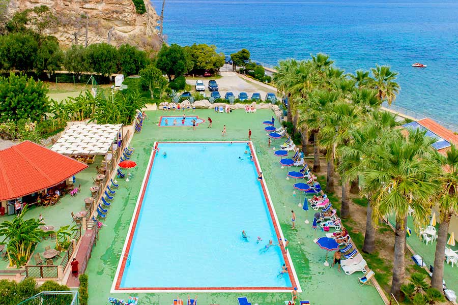 Sistemazioni: La struttura dispone di camere dislocate su due livelli, in caratteristiche strutture immerse nel rigoglioso giardino. Arredate in stile impero, sono tutte dotate di servizi privati con doccia e phon, aria condizionata, tv color, telefono, mini frigo e cassaforte. Si dividono in Standard doppie e triple, quadruple composte da un unico ambiente con 3°/4° letto a castello o letti piani; alcune sono ubicate a piano terra con patio esterno attrezzato vista giardino, ed altre al 1° piano con finestra; Doppie superior vista mare, con ampia vista panoramica nella Baia di Sant'Irene, tutte situate al 1° piano con finestra; Bicamere composte da due camere da letto comunicanti con 2 bagni, ubicate a piano terra, vista giardino con patio esterno attrezzato; Camere Quadruple soppalcate, composte da una camera da letto e 3°/4° letto su soppalco basso raggiungibile con una scaletta in legno, situate a piano terra con patio esterno attrezzato; Bungalow 3 letti (unico ambiente con letto matrimoniale e 3° letto); Bungalow bicamera 4 letti (composti da una camera matrimoniale e una camera con 3°/4° letto a castello o letti piani). I Bungalow dispongono di un arredamento confortevole ma più semplice ed essenziale rispetto alle camere, sono tutti ubicati a piano terra con patio esterno attrezzato.