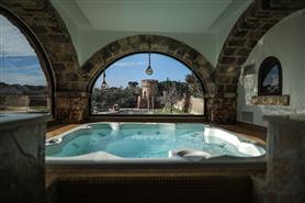 Top Suite con Vasca idromassaggio: Ampi spazi, bianco dominante, grande vasca dromassaggio circolare, queste le caratteristiche della Suite. Arredi di charme e tutte le dotazioni utili quali aria condizionata, riscaldamento, frigobar con una bottiglia di prosecco pugliese, TV sat, telefono diretto, wi-fi gratis, cassaforte. La Suite si sviluppa in vari ambienti congiunti per un totale di circa 65 mq. e dispone di 2 letti matrimoniali di cui uno sul piano rialzato, 2 bagni separati, un comodo terrazzino privato e l'angolo cottura celato in un mobile in stile.