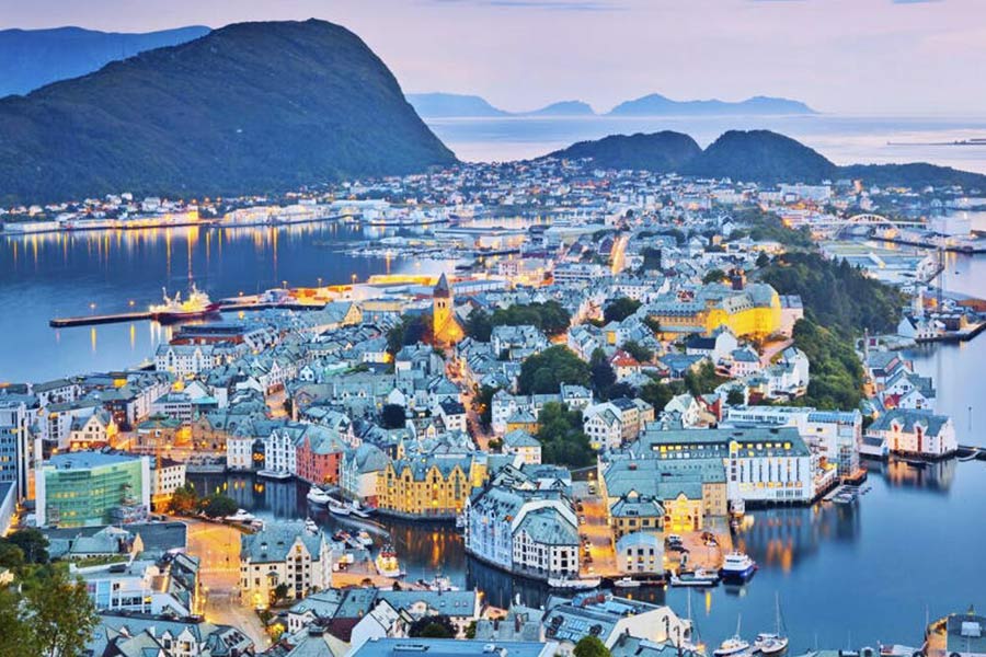 Colazione in hotel. Partenza attraverso scenari mozzafiato per la deliziosa cittadina di Ålesund, una vera e propria città museo che sorge su piccole isole collegate tra loro e che vive di attività pescherecce. Arrivo nel pomeriggio e tempo a disposizione con l’accompagnatore per la scoperta di questo gioiello della Norvegia. Pernottamento Hotel Noreg o similare.