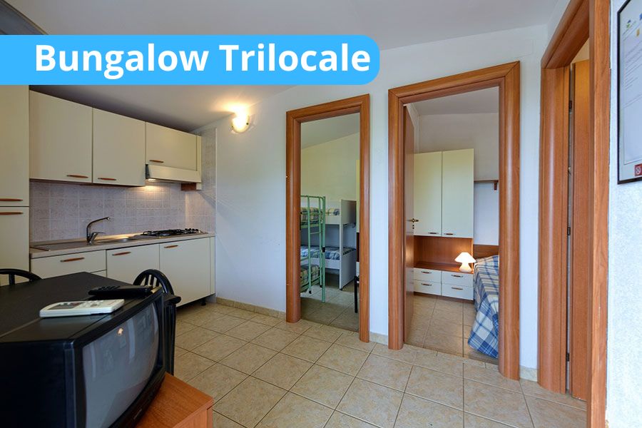 - Bungalow trilocale 6 posti letto: - Camera con letto matrimoniale e cameretta con 2 letti a castello: soggiorno con angolo cottura di cortesia, TV-Led, aria condizionata, cassaforte e servizi privati con box doccia e phon: veranda coperta, attrezzata con tavolo e sedie da giardino (ca. 40mq).