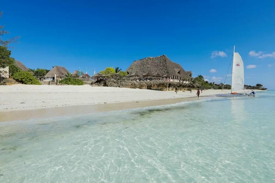 Spiaggia: Incantevole, di sabbia finissima, intervallata da rocce e lambita da acque trasparenti. Si trova subito sotto una terrazza di sabbia attrezzata con ombrelloni e lettini gratuiti fino ad esaurimento; teli mare gratuiti. Il fenomeno delle maree, anche se meno incisivo che in altre spiagge di Zanzibar, rende il paesaggio diverso con il trascorrere delle ore.