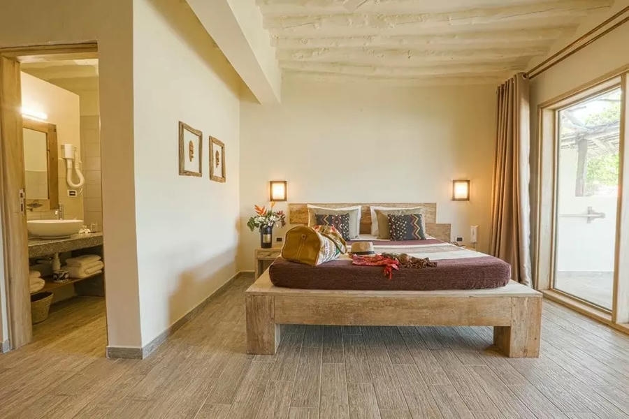 Camere: 63 camere in stile etnico dotate di veranda, servizi privati con doccia, asciugacapelli, letto king size (2 x 1,95m), aria condizionata, ventilatore a pale, Tv, minifrigo e cassetta di sicurezza. Corrente a 230 volt con prese di tipo italiano.