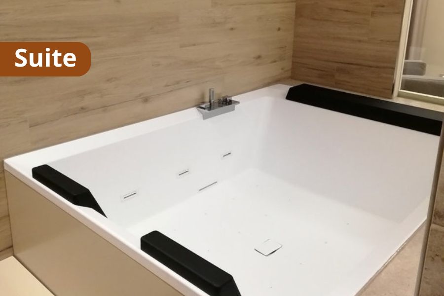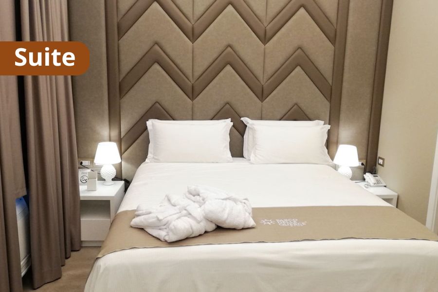 CAMERE: Camere Superior - Concedetevi un soggiorno indimenticabile nelle nostre Camere Superior, dove l’eleganza incontra il massimo comfort. Progettate per offrirvi un’esperienza di relax e benessere superiore, queste camere sono un rifugio di stile e funzionalità. L’armonia di uno spazio dallo stile shabby ma raffinato, con letto king size. La Superior matrimoniale è situata al piano terra, si apre su un cortile interno a chiostro, il luogo ideale per godersi momenti di pace. Si informa che la presenza di cani deve essere indicata in fase di prenotazione contattando l’ufficio prenotazione in quanto ammessi solo su richiesta e solo in alcune categorie di camera. Sono ammessi esclusivamente cani di piccola taglia (massimo 8/10 kg). Dimensioni della camera: 16m² – Fino a 2 adulti (più un neonato di età massima di 2 anni in culla). Caratteristiche: Patio privato, Letto king-size o due letti separati, Smart TV, Telefono, Cassaforte e Minibar. Suite - Entrate in un mondo di comfort senza pari con la nostra esclusiva Suite. Progettate per superare ogni aspettativa, con uno spazio generoso, servizi impeccabili e un’atmosfera di lusso che trasforma ogni soggiorno in un’esperienza indimenticabile. L’armonia di uno spazio dallo stile shabby ma raffinato, con letto king size. La Superior matrimoniale è situata al piano terra, si apre su un cortile interno a chiostro, il luogo ideale per godersi momenti di pace. Si informa che la presenza di cani deve essere indicata in fase di prenotazione contattando l’ufficio prenotazione in quanto ammessi solo su richiesta e solo in alcune categorie di camera. Sono ammessi esclusivamente cani di piccola taglia (massimo 8/10 kg). Dimensioni della camera: 31m², Letto King-size di design, Zona living separata: Arredata con divano confortevole (che diventa letto), Bagno padronale spazioso: Con doccia walk-in, vasca idromassaggio, prodotti da bagno di design e morbidi accappatoi e pantofole. Smart TV LED, Connessione Wi-Fi, Telefono, Cassaforte, Minibar