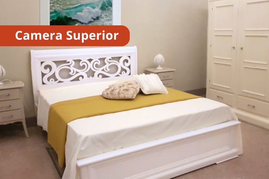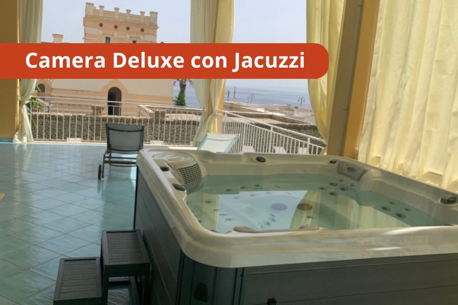 CAMERE: Le Camere si dividono in Camere Superior e Camere Deluxe con terrazza vista mare e jacuzzi ad uso esclusivo ed illimitato. Le 4 Camere Deluxe si dividono in: Solanum, Fetida, Cesarea e Romanelli. Le Camere Superior si dividono in: Solfatara, Gattulla, Oleandro, De Donno e Sullfurea. Servizi presenti in camera: doccia e phon, TV, Wi-Fi, mini frigo, cassaforte, riscaldamento e aria condizionata.