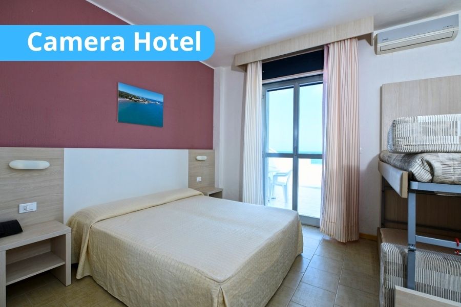 • Camere Hotel: dotate di balcone, aria condizionata, mminifrigo, cassaforte, TV, servizi privati con doccia e asciugacapelli. Alcune con balcone lato mare e vista mare