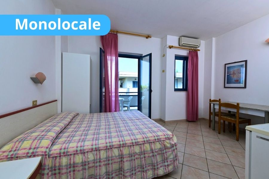• Appartamenti monolocali (soggiorno da domenica a domenica): monolocali ubicati nelle palazzine residence, nella parte alta del Villaggio, composti da letto matrimoniale e letto singolo o letto a castello, angolo cottura di cortesia (solo in alcuni di essi), TV, aria condizionata, cassaforte e servizi privati con doccia e asciugacapelli