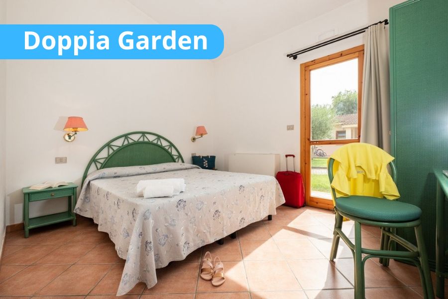 Camere: La struttura dispone di 134 camere sul modello delle villette a schiera dislocate all’interno del parco. Si suddividono in: Camere Garden, più spaziose e luminose; doppie, triple (composte da due vani, un bagno e unico ingresso), quadruple (composte da due vani, due bagni e unico ingresso). Camere Classic: con porta finestra; doppie e quadruple (composte da due camere doppie comunicanti). Tutte le camere sono dotate di servizi privati con doccia e asciugacapelli, patio, aria condizionata, TV, wi-fi, telefono e frigobar (riempimento su richiesta a pagamento). Doppia Garden: Ideale per chi viaggia in coppia o da solo, la camera è dotata di matrimoniale o due letti singoli secondo le vostre preferenze.