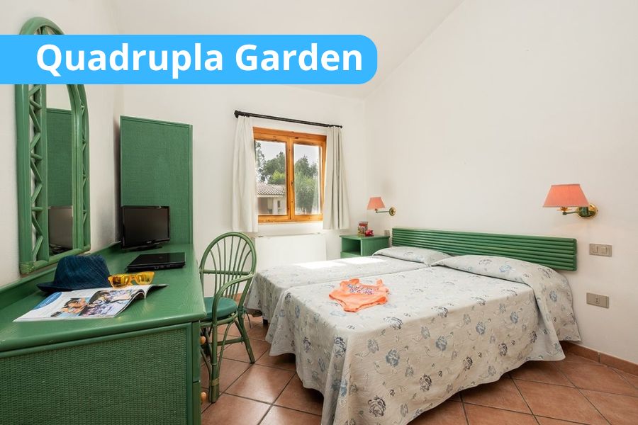 Le camere sul modello delle villette a schiera, dislocate all'interno del parco, sono confortevoli e di varia tipologia, tutte con patio e dotate di aria condizionata con regolazione autonoma, TV, Wi-fi, telefono e frigobar* (*riempimento a pagamento). Il bagno privato è dotato di doccia, asciugacapelli e set di prodotti da bagno. Doppia Garden (Uso Singola) Ideale per chi viaggia in coppia o da solo, la camera è dotata di matrimoniale o due letti singoli secondo le vostre preferenze. Le camere sul modello delle villette a schiera, dislocate all'interno del parco, sono confortevoli e di varia tipologia, tutte con patio e dotate di aria condizionata con regolazione autonoma, TV, Wi-fi, telefono e frigobar* (*riempimento a pagamento). Il bagno privato è dotato di doccia, asciugacapelli e set di prodotti da bagno. Doppia Garden (disabili): Ideale per chi viaggia in coppia o da solo, la camera è dotata di letto matrimoniale o due letti singoli secondo le vostre preferenze. Le camere sul modello delle villette a schiera, dislocate all'interno del parco, sono confortevoli e di varia tipologia, tutte con patio e dotate di aria condizionata con regolazione autonoma, TV, Wi-fi, telefono e frigobar*(*riempimento a pagamento). Il bagno privato, adatto a persone con disabilità, è dotato di doccia, asciugacapelli e set di prodotti da bagno. Tripla Garden: Ideale per tre persone o per una coppia con bambino, la camera è matrimoniale e con un letto singolo o secondo le vostre preferenze. Le camere, spaziose e luminose, sono tutte con patio e dotate di aria condizionata con regolazione autonoma, TV, Wi-Fi, telefono e frigobar* (*riempimento a pagamento). Il bagno privato è dotato di doccia, asciugacapelli e set di prodotti da bagno. Tripla Garden (Disabili). Ideale per tre persone o per una coppia con bambino, la camera è matrimoniale e con un letto singolo o secondo le vostre preferenze. Le camere, spaziose e luminose, sono tutte con patio e dotate di aria condizionata con regolazione autonoma, TV, Wi-Fi, telefono e frigobar* (*riempimento a pagamento). Il bagno privato, adatto a persone con disabilità, è dotato di doccia, asciugacapelli e set di prodotti da bagno. Quadrupla Garden: Ideale per quattro persone o per una famiglia con due bambini, la camera dispone di letto matrimoniale e due letti singoli o secondo le vostre preferenze. Le camere, spaziose e luminose, sono composte da due vani comunicanti, due bagni e un unico ingresso; tutte dispongono di un patio e sono dotate di aria condizionata con regolazione autonoma, TV, Wi-Fi, telefono e frigobar* (*riempimento a pagamento). Sono presenti due bagni privati con doccia, asciugacapelli e set di prodotti da bagno. Quadrupla Garden (Disabili): Ideale per quattro persone o per una famiglia con due bambini, la camera dispone di letto matrimoniale e due letti singoli o secondo le vostre preferenze. Le camere, spaziose e luminose, sono composte da due vani comunicanti, due bagni e un unico ingresso; tutte dispongono di un patio e sono dotate di aria condizionata con regolazione autonoma, TV, Wi-Fi, telefono e frigobar*( *riempimento a pagamento). Sono presenti due bagni privati con doccia, asciugacapelli e set di prodotti da bagno. Quintupla Garden: Ideale per cinque persone o per una famiglia con bambini, matrimoniale e con tre letti singoli o secondo le vostre preferenze.
